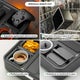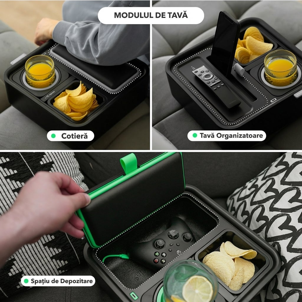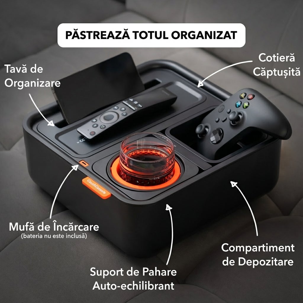 Tava ține telefonul, telecomenzile, ochelarii, căștile — totul organizat într-un singur loc — sau o întorci și se transformă într-o cotieră comodă când te relaxezi pe canapea.